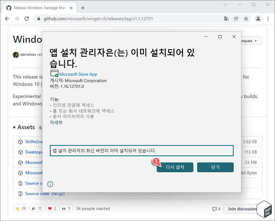 위 예시 화면은 Microsoft Store를 통해 이미 설치된 상태로, 패키지 설치 화면에서 [업데이트] 또는 [다시 설치] 버튼을 클릭합니다. 마찬가지로 설치 완료 후 컴퓨터를 다시 시작하면 WINGET 도구를 사용할 수 있습니다.