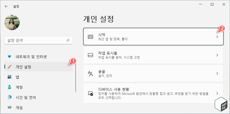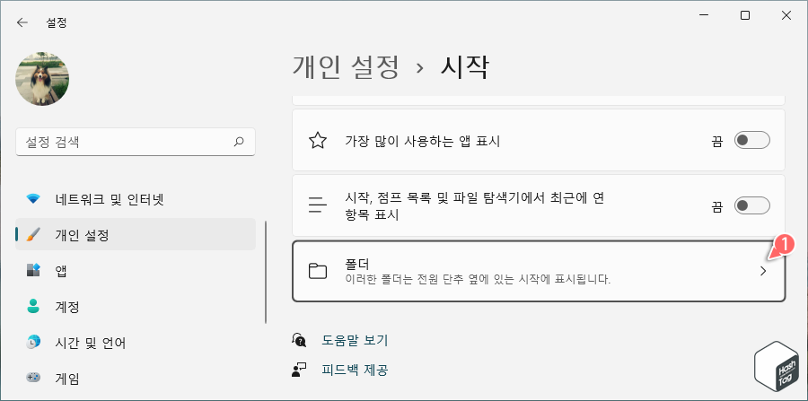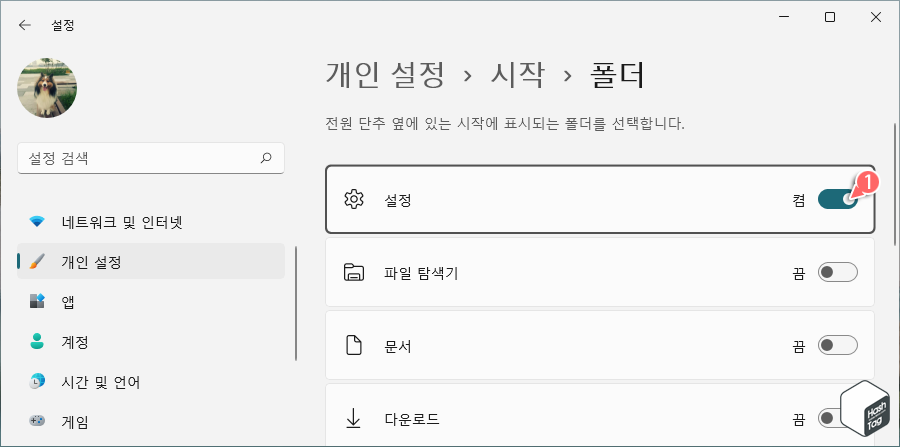 HowTo - Windows 11 시작 메뉴의 전원 단추 옆에 표시되는 폴더 설정 방법