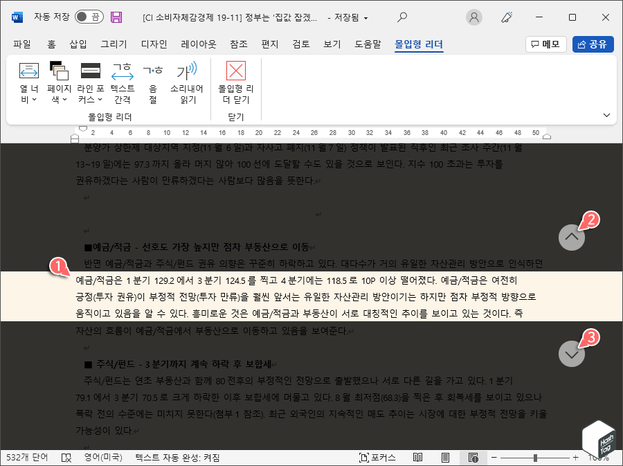 몰입형 리더 기능 중 핵식 기능으로 글을 읽을 때 주의가 다른 곳으로 분산되지 않고 현재 읽고 있는 부분만 집중할 수 있습니다. 현재 문서의 열 너비에 따라 한 번에 보여지는 강조 영역이 달라지므로 상황에 따라 적절히 사용하시면 됩니다.
