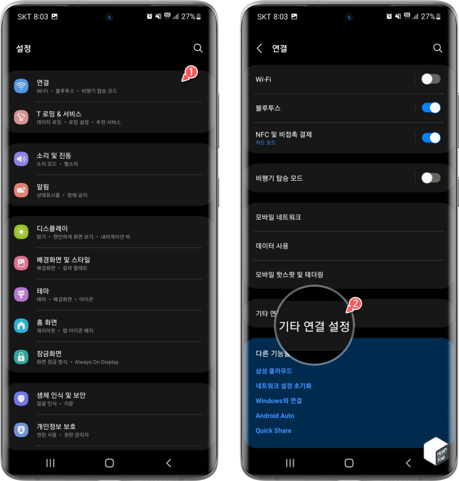 삼성 갤럭시 휴대전화에서 [설정] 앱으로 이동한 다음 [연결 > 기타 연결 설정]을 순서대로 탭 합니다.