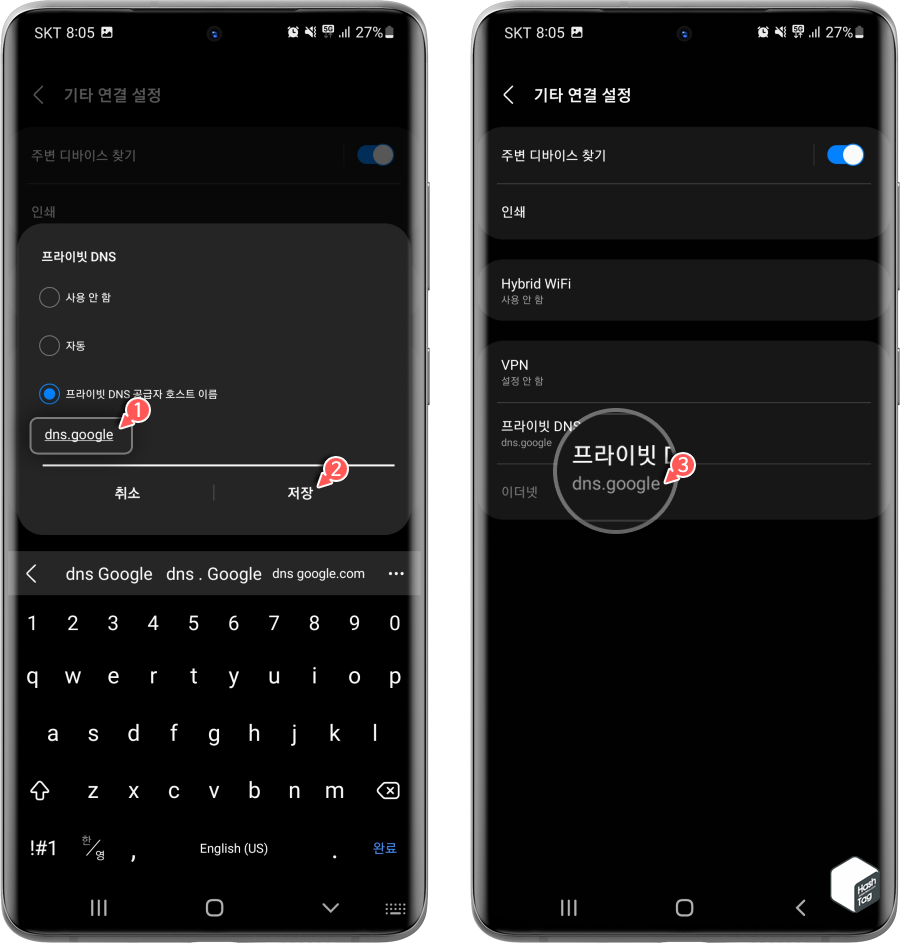 호스트 이름은 "dns.google"로 입력하고 [저장] 버튼을 탭 합니다. 이제 프라이빗 DNS 설정은 자동에서 dns.google로 변경된 것을 확인할 수 있습니다.