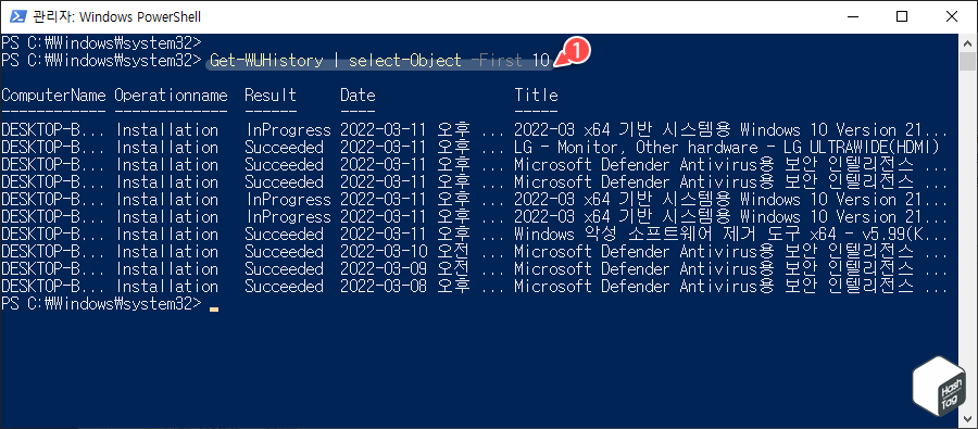 PowerShell에서 Microsoft PSWindowsUpdate 모듈을 사용하여 업데이트를 수행, 제거, 기록을 확인하는 등의 보다 체계적인 관리도 가능합니다.