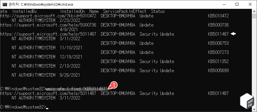 예를 들어 KB5011487 번호를 이용하여 wmic qfe | find "KB5011487" 명령어를 입력하여 검색하면 해당 보안 업데이트 기록에 대한 내용을 확인할 수 있습니다. 만약 특정 날짜에 수행된 업데이트 기록을 확인하고 싶다면 find 옵션에서 원하는 검색어를 입력하여 검색하시면 됩니다.