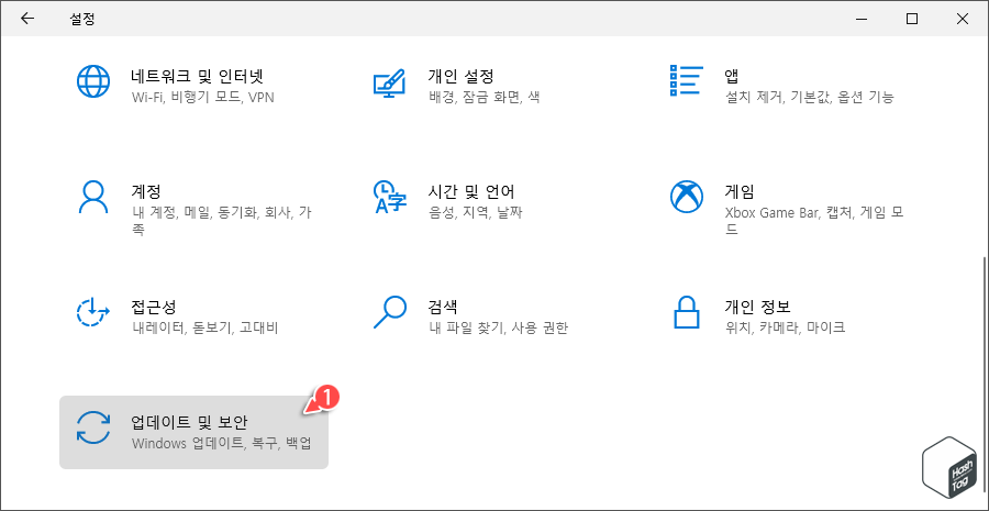 키보드 단축키 Win + I 키를 누르고 Windows 설정 앱이 열리면 [업데이트 및 보안]을 클릭합니다.