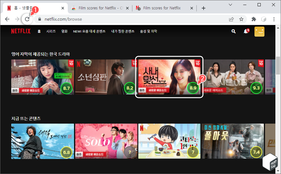확장 프로그램 설치 및 구성이 완료되면 브라우저 새로 고침 버튼을 클릭하여 확장 프로그램을 넷플릭스 메인 화면에 적용시킵니다. 이제 사용자가 Film Scores for Netflix 확장 프로그램 설정에서 선택한 기본(Default) 서비스 평점이 콘텐츠 목록에서 확인할 수 있습니다. 어떤 타이틀을 볼지 고민이 된다면 이러한 평점을 참고하여 선택하실 수 있습니다.