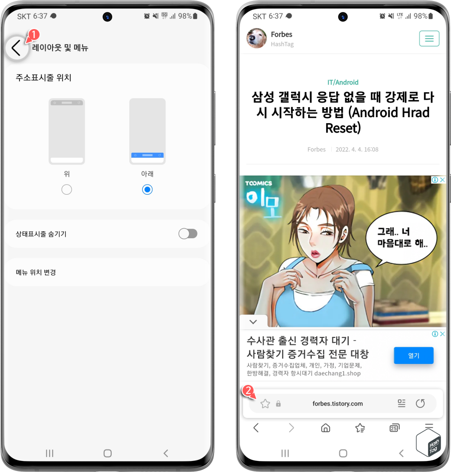 Mobile - Samsung Internet App 주소 표시줄 하단으로 이동하는 방법