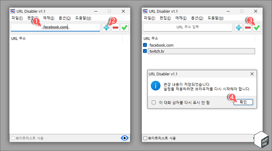 텍스트 입력 상자에 차단을 원하는 "URL"을 입력하고 [+] 버튼을 클릭하여 목록에 추가합니다. 동일 작업을 반복하여 모든 웹 사이트를 차단 목록에 추가하고 [✔] 버튼을 클릭하여 변경 사항을 적용합니다.