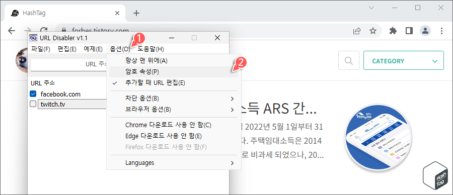 같은 메뉴에서 [암호 속성(P)]을 사용하여 URL Disabler 도구의 암호를 설정할 수 있습니다.