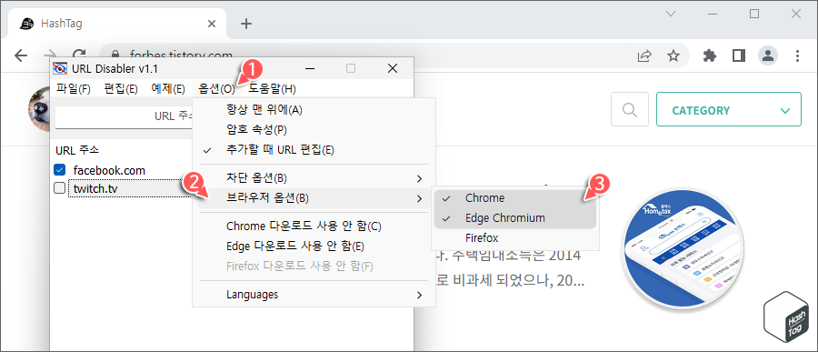 URL Disabler 도구에서 [옵션(O) > 브라우저 옵션(B)] 메뉴를 통해 차단을 적용할 브라우저를 선택할 수 있습니다.