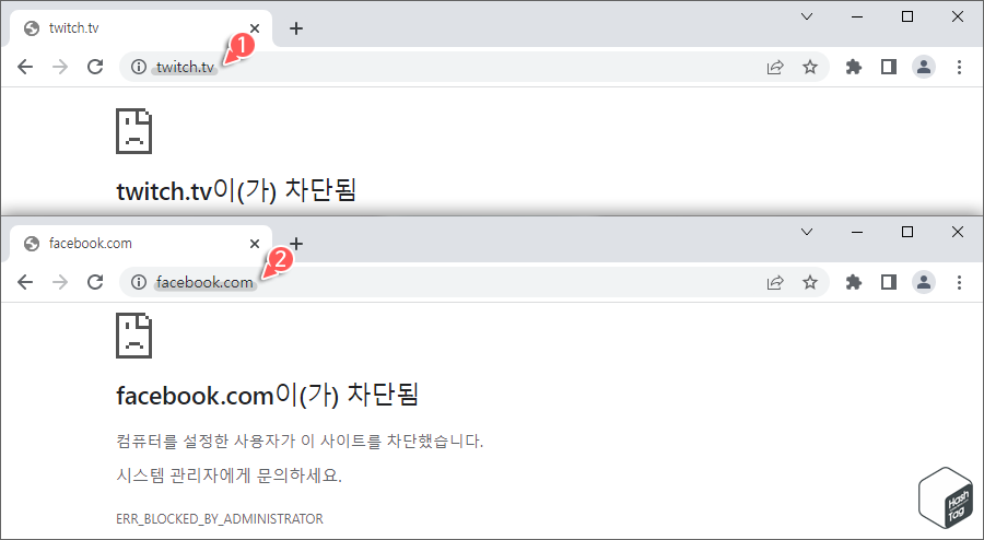 Google Chrome 브라우저를 열고 테스트해보면 차단 목록에 있는 웹 사이트를 모두 연결할 수 없으며, 관리자에 의해 차단된 메시지가 브라우저에 표시됩니다.