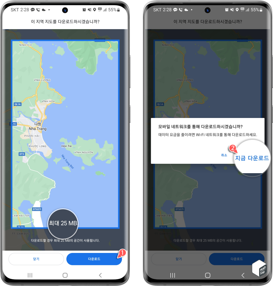 오프라인으로 이용하려는 지도의 영역을 정했다면 [다운로드] 버튼을 누릅니다. Wi-Fi 네트워크에 연결되어 있지 않다면 모바일 네트워크를 통해 다운로드할 수 있도록 [지금 다운로드]를 선택하여 데이터를 저장합니다. 참고로 영역선 하단에 사용자가 지정한 범위로 다운로드할 경우 사용되는 용량을 확인할 수 있습니다.
