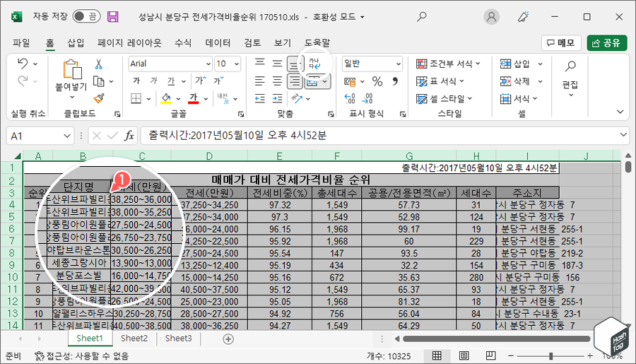 엑셀 시트에서 일부 데이터가 보이지 않거나 깔끔하지 않게 보이는 경우 서식 옵션을 사용하거나 행과 열의 테두리 선을 두 번 클릭하여 자동으로 사용자가 선택한 영역의 행과 열의 크기를 조절할 수 있는 방법을 사용하면 간단히 해결될 문제입니다.