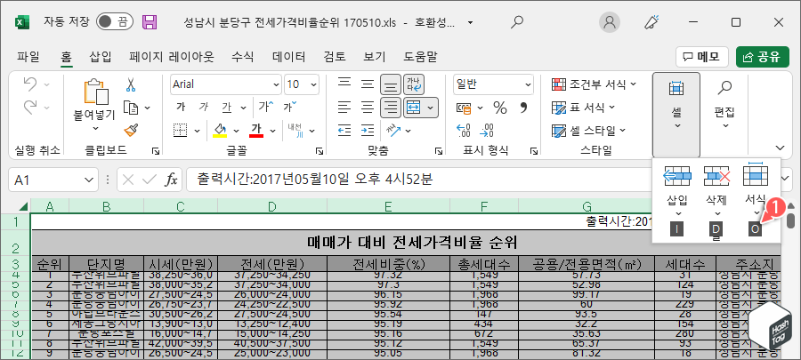 1 '서식' 옵션으로 행 높이, 열 너비 자동 맞춤 설정