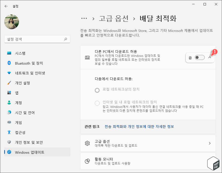 Windows 업데이트 > 고급 옵션 > 배달 최적화 > 고급 옵션