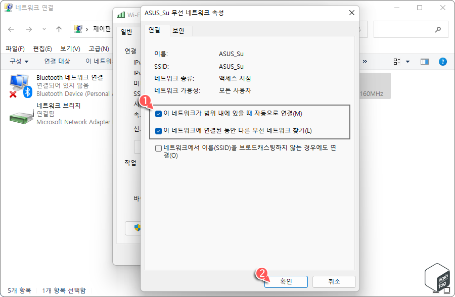 무선 속성 창의 [연결] 탭에서 다음 두 가지 옵션을 모두 선택하고 [확인] 버튼을 클릭합니다.