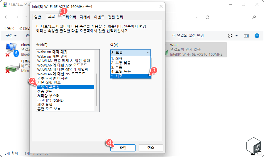 Wi-Fi 어댑터 속성 창에서 [고급] 탭으로 이동합니다. "속성(P)" 목록에서 "로밍의 주동성"을, "값(V)"은 "5. 최고"를 선택합니다. 변경 사항을 적용하기 위해 [확인] 버튼을 누르고 시스템을 다시 시작합니다.