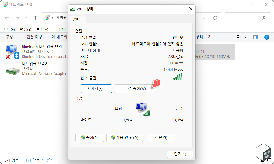 "Wi-Fi 상태" 창에서 [무선 속성(W)]을 클릭합니다.
