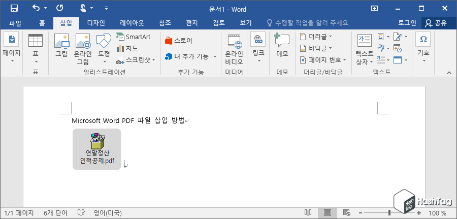 해당 문제로 인하여 PDF 아이콘이 표시되지 않았다면, 다시 문서 내에 개체 삽입을 진행할 때 정상적으로 아이콘이 표시되는 것을 확인하실 수 있습니다.