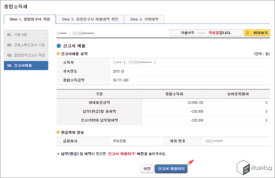 신고서를 제출하기 전 신고서내용 요약 및 환급계좌 정보를 다시 한 번 확인한 뒤 [신고서 제출하기] 버튼을 클릭합니다.