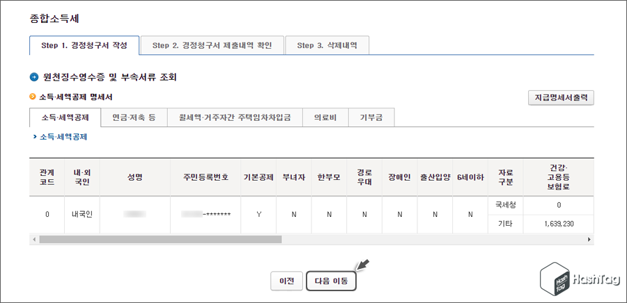 경정청구를 진행하려는 귀속년도 연말정산에 등록된 기본공제(인적공제) 대상자가 목록에 표시됩니다. 해당 경정청구는 기본공제 대상자는 변동이 없으므로 [다음 이동] 버튼을 클릭합니다.