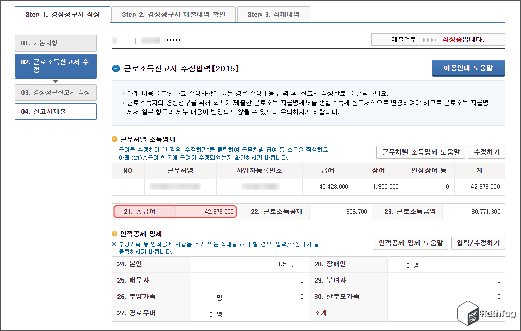 해당 귀속년도에 신고된 근로소득신고서 화면이 나타납니다. 여기서 "21. 총급여" 항목의 급여액을 메모해둡니다.