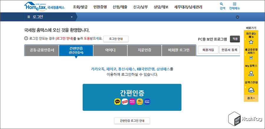 먼저 국세청 홈택스(www.hometax.go.kr) 접속 후 공동·금융인증서 또는 간편인증(민간인증서)을 이용하여 로그인을 진행합니다. 참고로 간편인증을 사용할 경우 공동인증서 인증을 위한 추가 보안 프로그램 설치가 필요하지 않아 편리합니다.