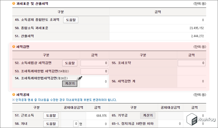 스크롤을 아래로 내려 '세액감면' 항목에서 "54. 조세특례제한법세액감면(제30조)" 하단의 [계산기] 버튼을 클릭합니다.