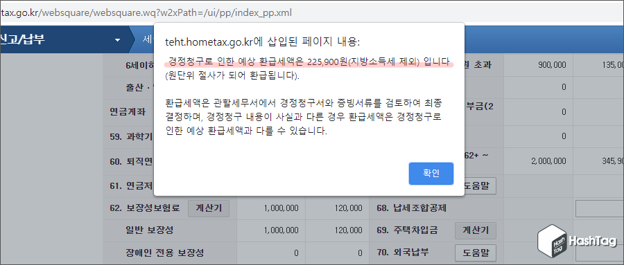 신고서 작성완료 시 알림 메시지로 다시 한 번 "경정청구로 인한 예상 환급액(지방소득세 제외)"을 확인할 수 있으며, 환급세액은 관할세무서에서 경정청구 및 증빙서류를 검토하여 최종 결정, 사실과 다른 경우 환급세액은 안내된 금액과 다를 수 있다는 안내 메시지를 확인 할 수 있습니다.