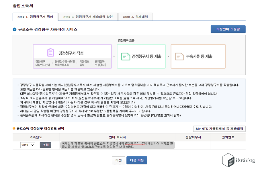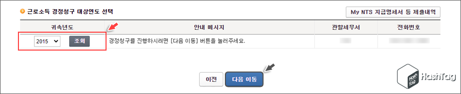 다음과 같이 "경정청구를 진행하시려면 [다음 이동] 버튼을 눌러주세요." 라는 메시지가 표시되면, 경정청구 신청이 가능합니다. 중소기업 취업자 소득세 감면 대상 관련 경정청구를 위해 [귀속년도]를 선택 후 [조회] 버튼을 누르고 [다음 이동] 버튼을 클릭합니다.