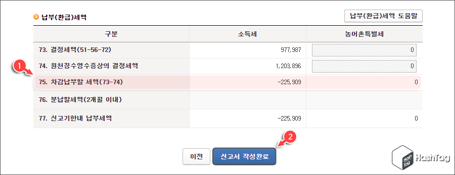 중소기업 취업청년 감면대상 총급여액을 적용한 뒤 '납부(환급)세액' 항목을 살펴보면, ①[75. 차감납부할 세액(73-74)] 금액이 "-" 마이너스 금액으로 표시되면 경정청구로 인해 추가 환급액이 발생됩니다. 금액 확인 후 ②[신고서 작성완료] 버튼을 클릭합니다.