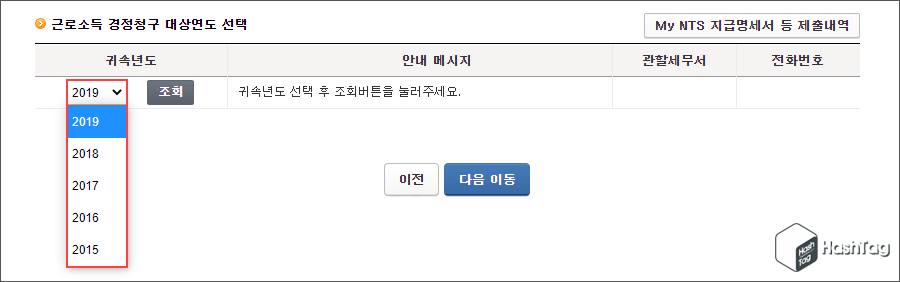 이때 경정청구를 진행 할 연도를 선택해야 하며 현재 이 글을 작성하는 시점에서는 "2015년부터 2019년 귀속년도"에 대해서만 경정청구를 진행할 수 있습니다.