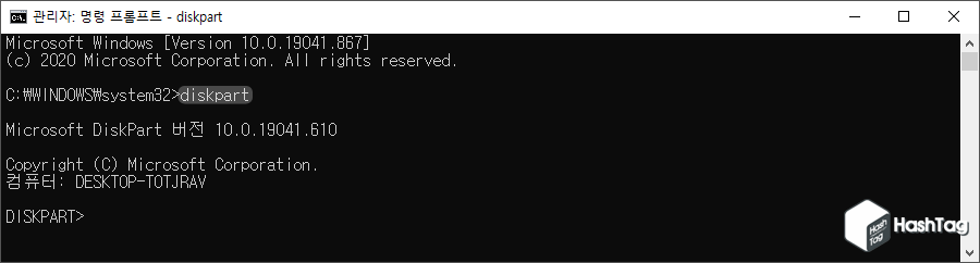 윈도우에서 시작 키를 누르고 명령 프롬프트(CMD)를 검색 후 [관리자 권한으로 실행] 옵션을 사용하여 실행합니다. 명령 프롬프트 창에서 [diskpart] 명령을 입력하여 DiskPart를 실행합니다.