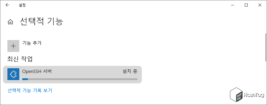OpenSSH 서버 옵션 설치가 진행됩니다. SSH 서버는 Windows 10 PC에서 구동되는 것으로 다른 시스템에서 실행되는 서버에 연결하는 것이 아닌 실제 해당 PC에서 서버를 실행하려는 경우에만 설치해야합니다.