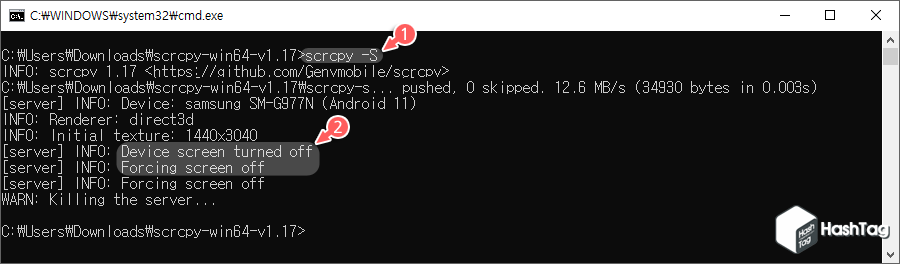 단순히 scrcpy.exe 파일 실행이 아닌 명령 프롬프트 창에서 실행 파일이 있는 폴더 경로로 이동하여 ① scrcpy -S 옵션으로 실행하면 ② Device screen thruned off 메시지가 나타나며 스마트폰 화면은 꺼지고, PC 미러링 화면만 나타나게 됩니다.