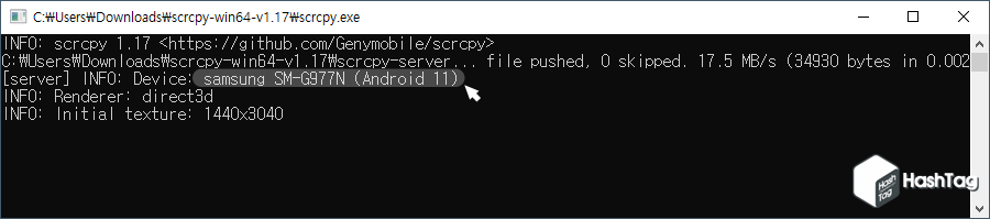 "scrcpy.exe" 실행 파일을 실행합니다. 명령 프롬프트 창이 자동으로 열리고 Device 및 해상도 등 정보가 표시되며, 스마트폰과 연동됩니다.