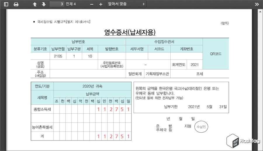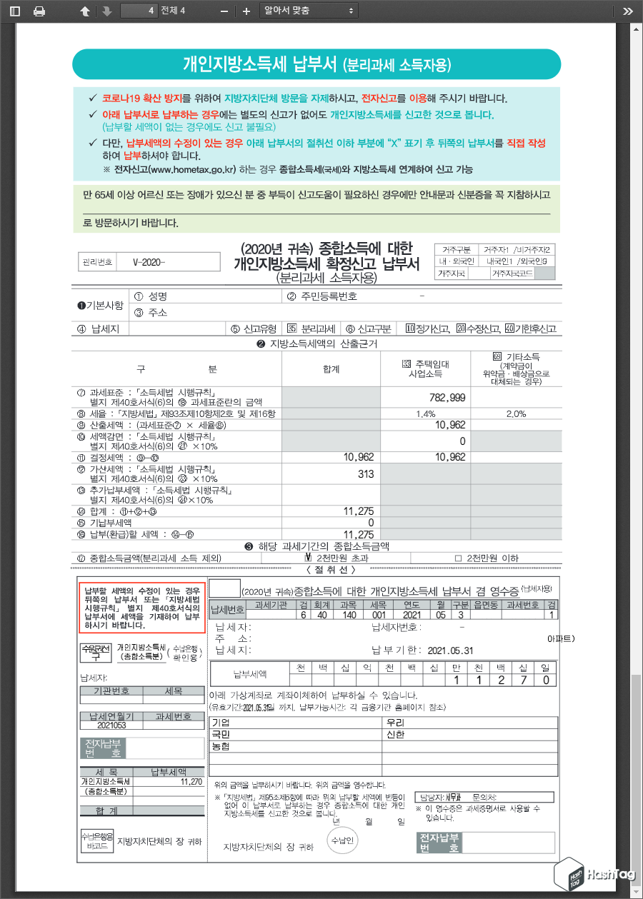 개인지방소득세 납부서 역시 마찬가지로 종합소득세 신고서 수정사항(종합소득세의 10%)이 없을 경우 동일하므로, 납부하시면 됩니다. 개인지방소득세는 납세자가 별도로 금액 등 추가 기재하여야 할 내용은 없으며, 납부서로 납부하는 경우 별도 신고가 없어도 '개인지방소득세를 신고'한 것으로 봅니다.