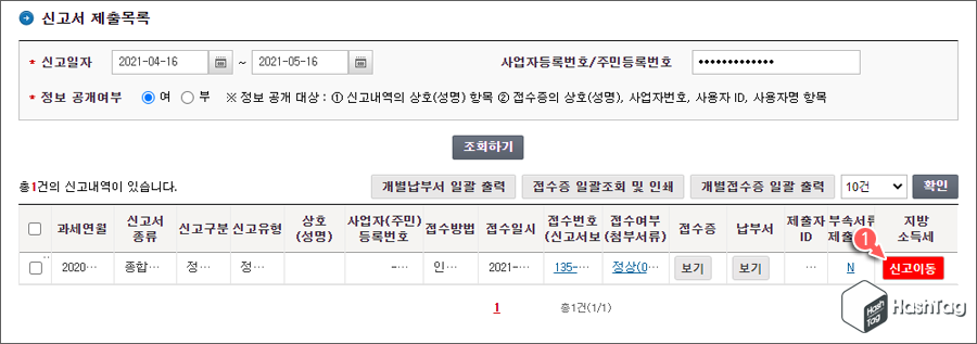 방금 신고를 마친 종합소득세 신고내역이 조회됩니다. "지방소득세" 란의 [신고이동] 버튼을 클릭합니다.