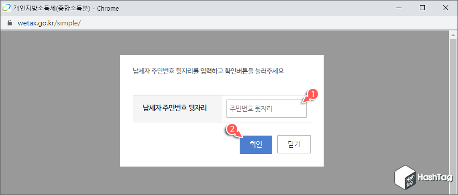 위택스 페이지가 열리고, 납세자 주민번호 뒷자리 입력 후 [확인] 버튼을 클릭합니다.