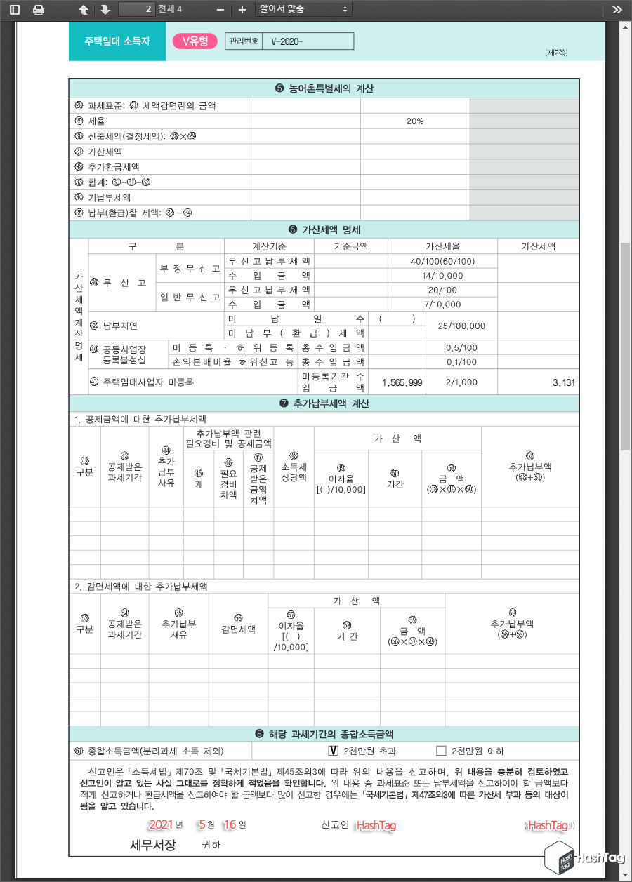 먼저 발송된 주택임대 소득자 V유형 신고서 우편물을 살펴보겠습니다. 사업장현황신고를 통해 이미 신고된 내역을 바탕으로 수입금액 등을 모두 기재한 신고서 및 납부할 세액까지 확인할 수 있습니다.
