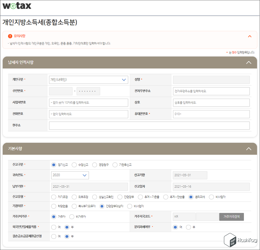 개인지방소득세(종합소득분) 내용이 조회되며 납세자 인적사항(* 필수 입력 항목) 및 기본사항을 확인합니다. 신고구분, 신고유형, 기장의무 등 대부분 필수입력 사항은 자동 입력된 상태로 이상유무만 확인하시면 됩니다.