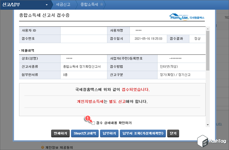 국세청홈택스에 종합소득세 신고서 접수 완료 후 접수증을 확인하실 수 있습니다. "접수 상세내용 확인하기" 체크 박스를 선택합니다.