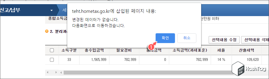여기서는 '주택임대소득 신고안내문(V)유형'을 받았으므로, 저장 후 다음이동 시 "변경된 데이터가 없습니다. 다음화면으로 이동하겠습니다." 라는 안내 메시지가 표시됩니다. [확인] 버튼을 클릭하여 세액계산으로 넘어갑니다.