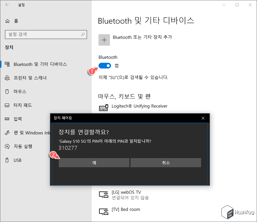 "Bluetooth 및 기타 디바이스"로 이동 후 "Bluetooth" 토글 스위치를 선택하여 [켬]으로 변경합니다. Android 스마트폰에서 해당 장치를 찾은 뒤 페어링을 시도할 경우 "장치를 연결할까요?" 메시지와 함께 PIN 번호 6자리가 표시됩니다.