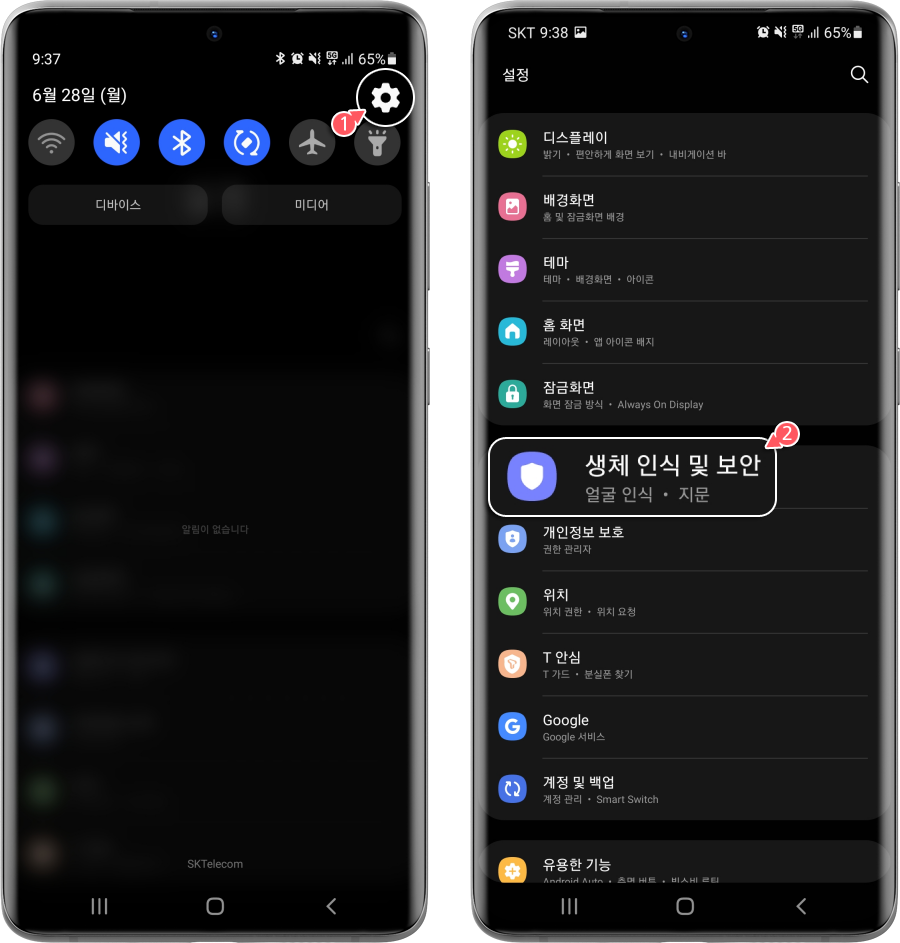스마트폰 화면 상단을 아래로 스와이프한 뒤 톱니바퀴 모양의 [설정]을 누르고 [생체 인식 및 보안]을 선택합니다.