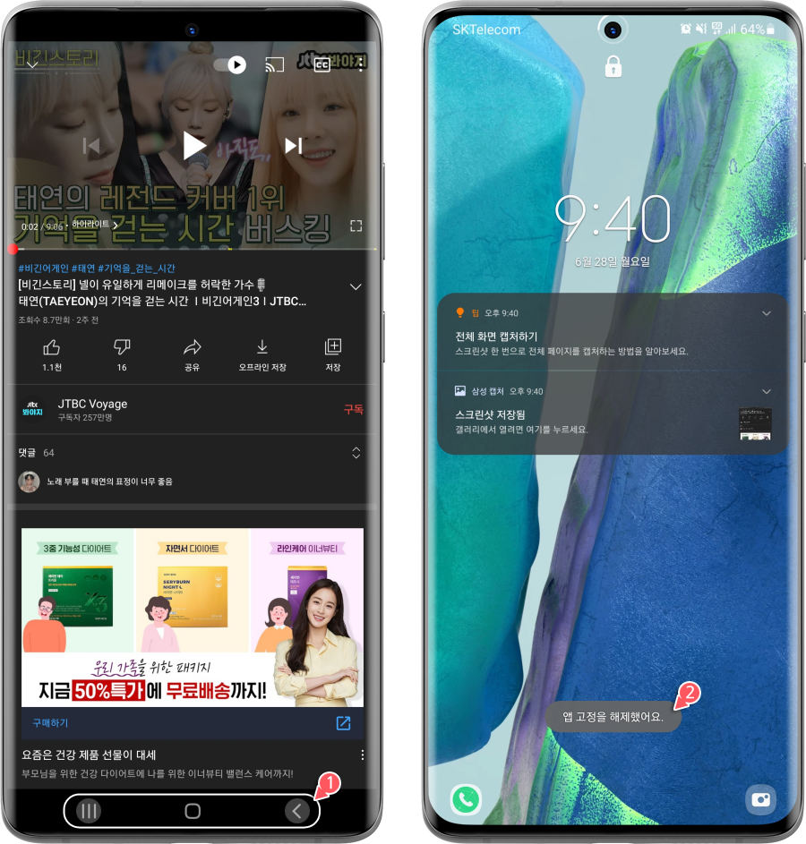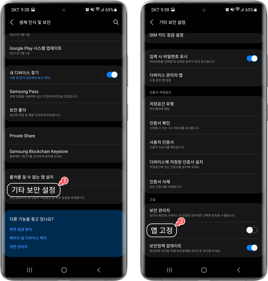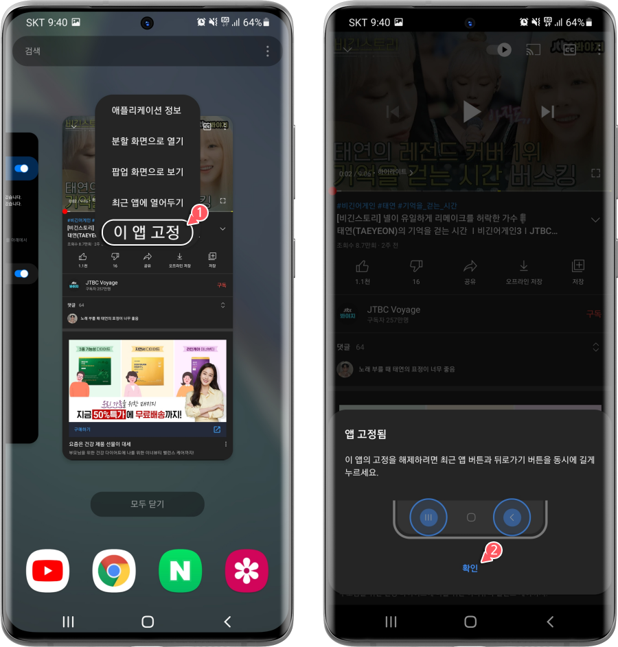 Mobile - 삼성 갤럭시 "앱 고정" 기능으로 사용중인 앱을 종료하지 못하도록 설정