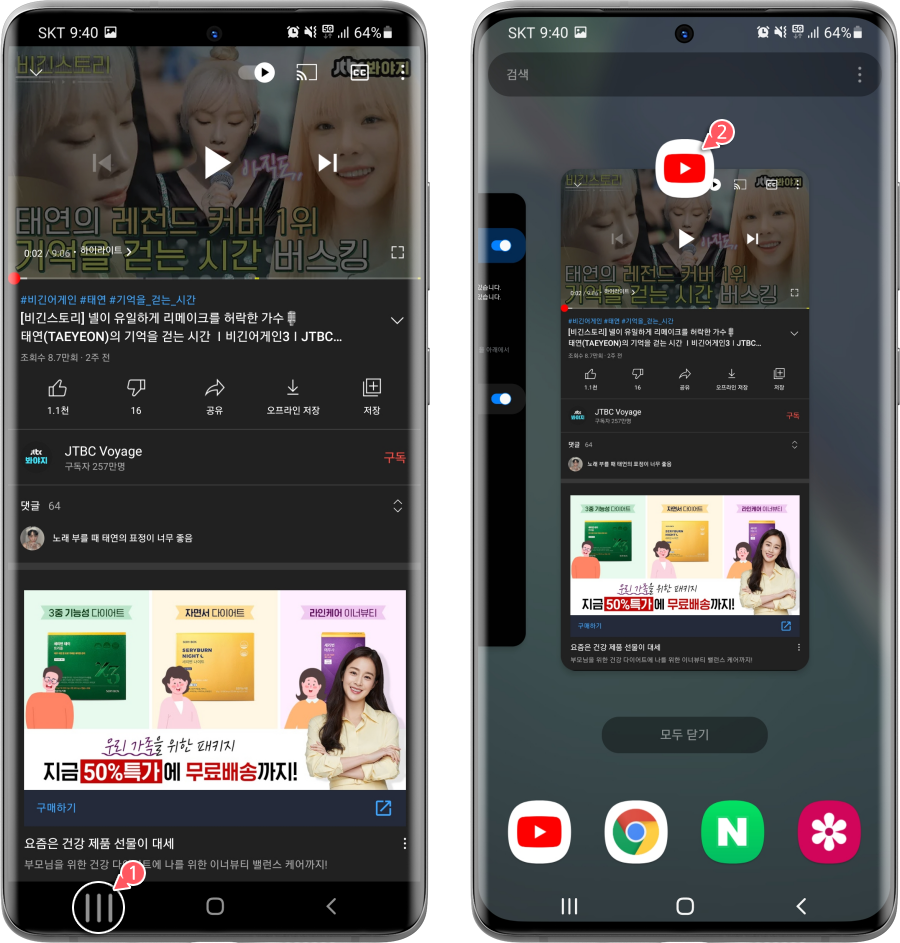 이제 어린 자녀가 유튜브 시청 중 [최근 앱 보기], [홈], [뒤로 가기] 버튼을 눌러도 해당 앱은 종료되거나 홈 화면으로 전환되지 않고 고정 상태로 유지됩니다. 즉, 부모 허락 없이는 현재 실행중인 앱 이외의 행동은 할 수 없습니다.