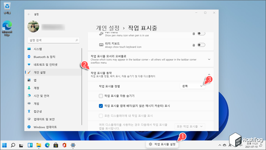 Windows 11 작업 표시줄 아이콘 왼쪽으로 정렬하기